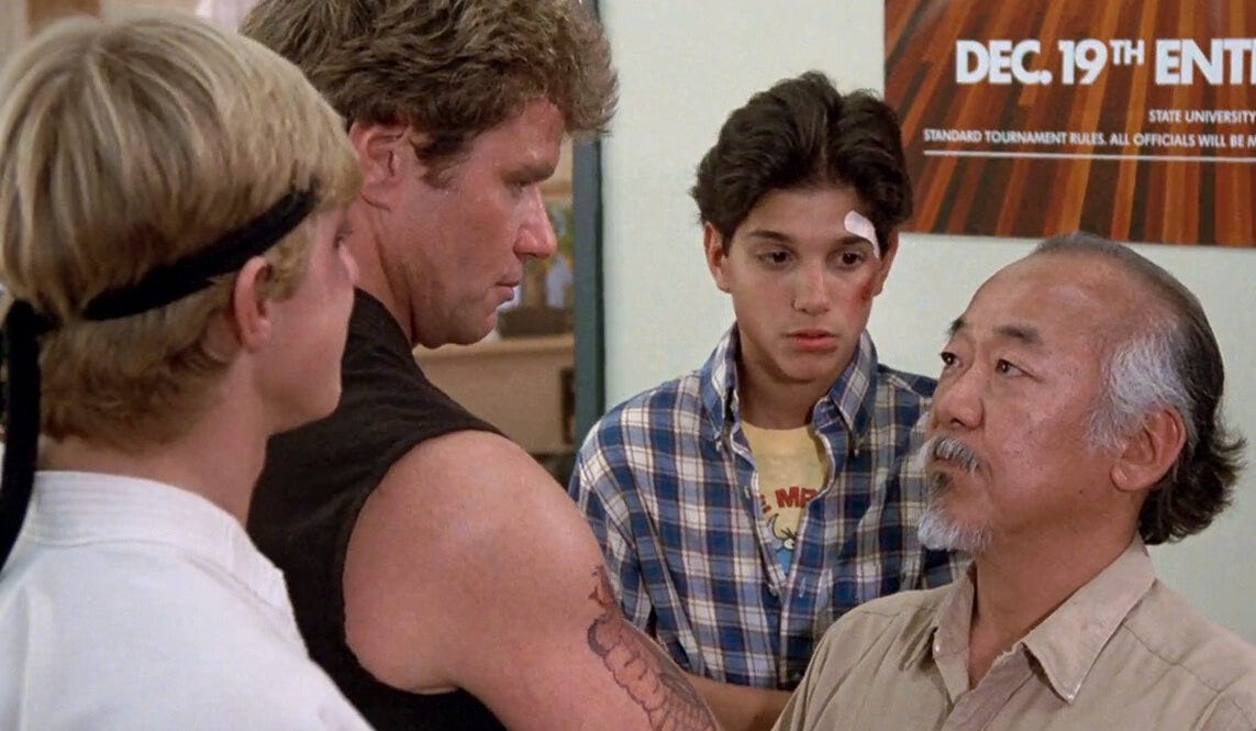 Or so we thought. Sensei and student have a falling out and they both painfully part ways, or, the teacher believes that the student has outgrown his guidance so leaves his pupil to fend for himself. The film ends with our protagonists teaming up again to defeat the forces of darkness or to learn a valuable lesson about family, friendship, standing up against evil, blah blah blah.